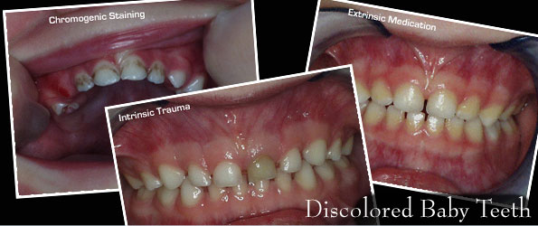 Discoloration of primary incisors (front teeth) may be extrinsic or intrinsic. Extrinsic discoloration is stain that can be removed by the toothbrush or a professional cleaning. Intrinsic discoloration is usually caused by a blow to the tooth.